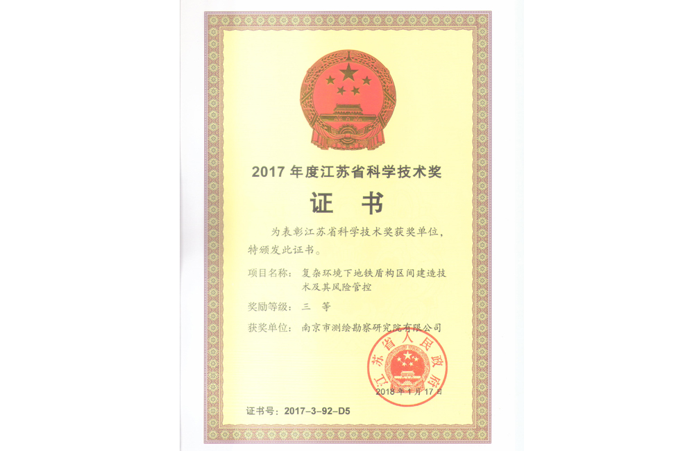 2017Äê¶È½ËÕÊ¡¿ÆÑ§ÊÖÒÕÈýµÈ½±¡ª¡ªÖØ´óÇéÐÎϵØÌú¶Ü¹¹Çø¼äÖÆ×÷ÊÖÒÕ¼°ÆäΣº¦¹Ü¿Ø